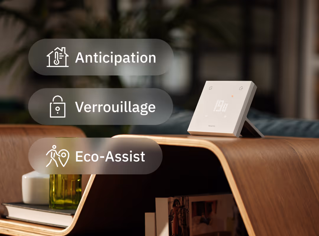 Profitez de fonctionnalités utiles à votre quotidien. Anticipation : le chauffage démarre au bon moment pour une température idéale, Verrouillage : évitez toute modification involontaire sur le Thermostat, Eco-Assist (géolocalisation) : recevez une alerte si vous partez sans baisser le chauffage, Auto-Care : recevez une alerte en cas de dysfonctionnement du système de chauffage.
