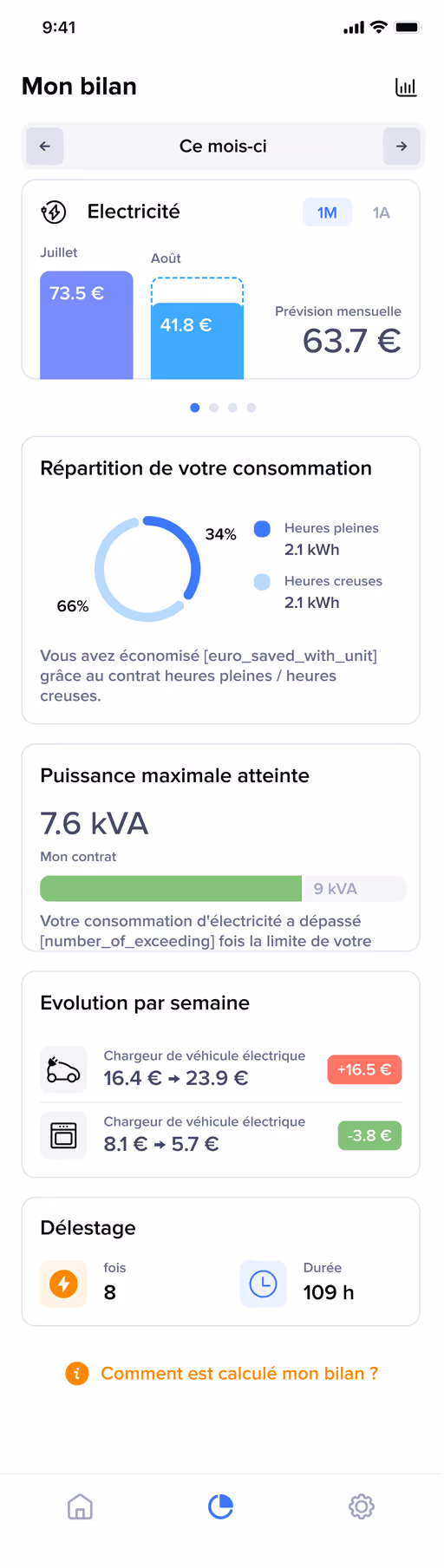 Suivez la consommation de vos appareils en temps réel, consultez vos historiques et accédez à votre bilan énergétique. Des graphiques détaillés vous indiquent votre consommation et le coût réel induit pour chaque appareil. Renseignez simplement votre contrat sur l’appli Home + Control!